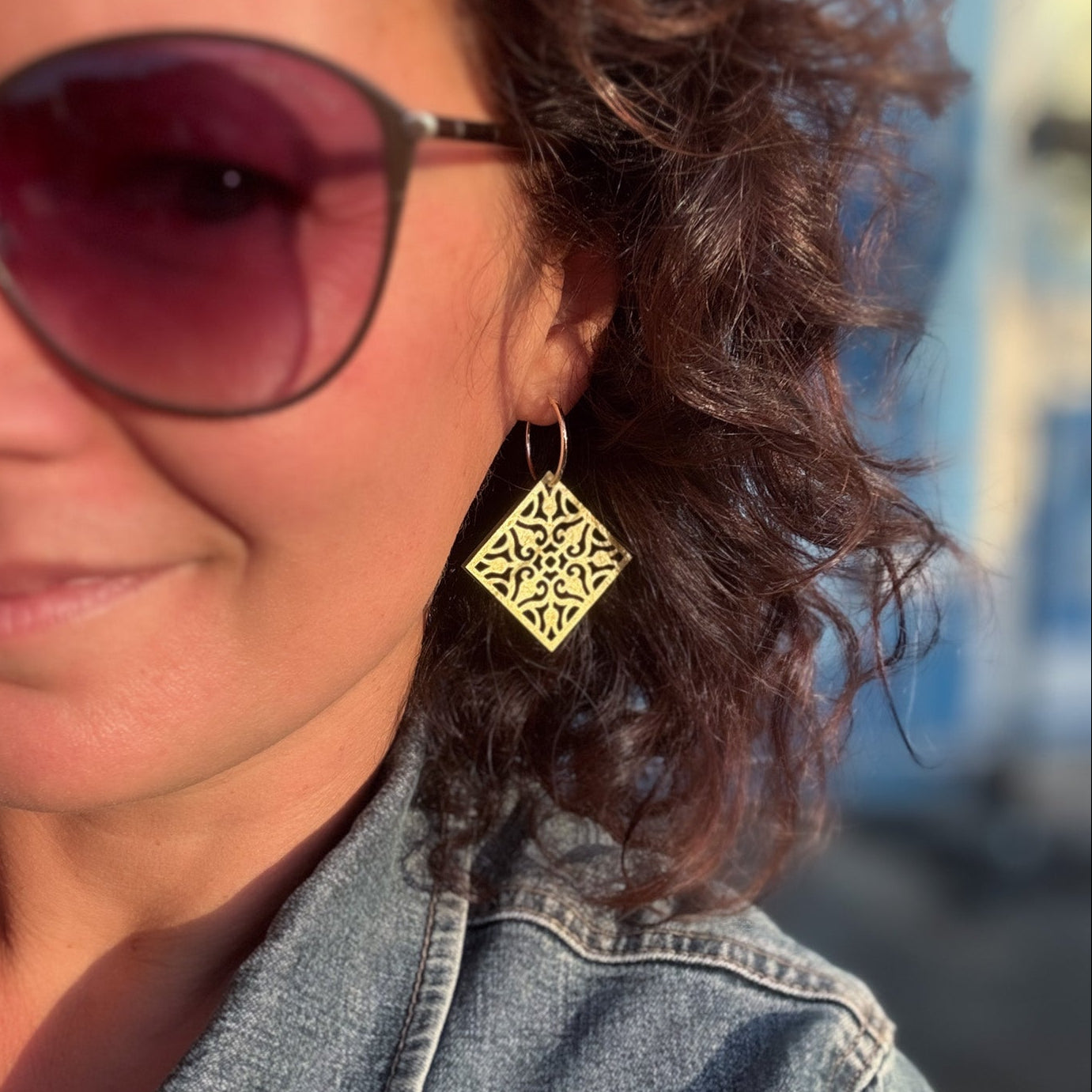 Our Carmen Hoops showcase a beautiful mediterranean pattern that is both delicate and bold. The large diamond-shaped charms measure approx. 2.5 x 2.5cm, yet they are so lightweight you will hardly feel that you are wearing them.