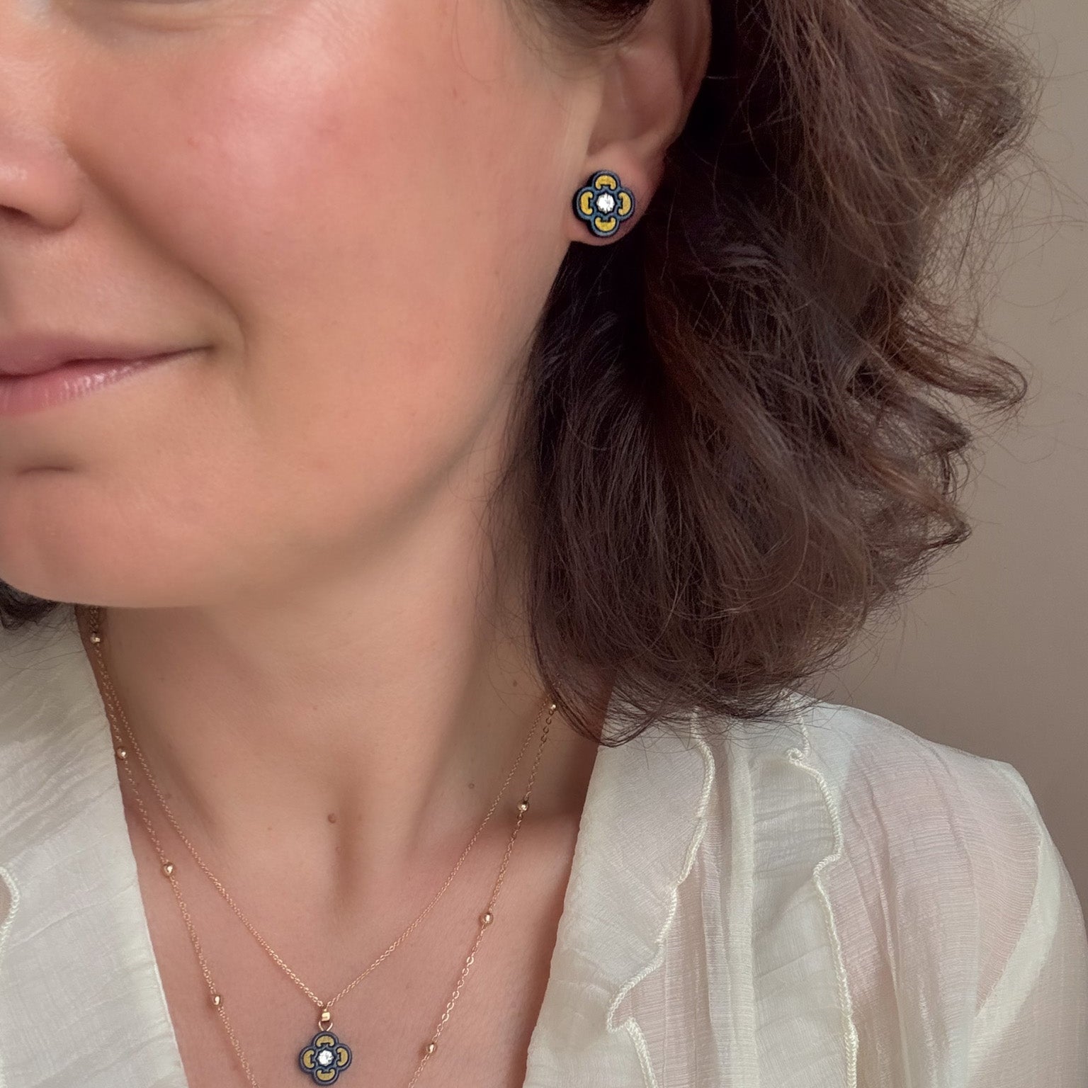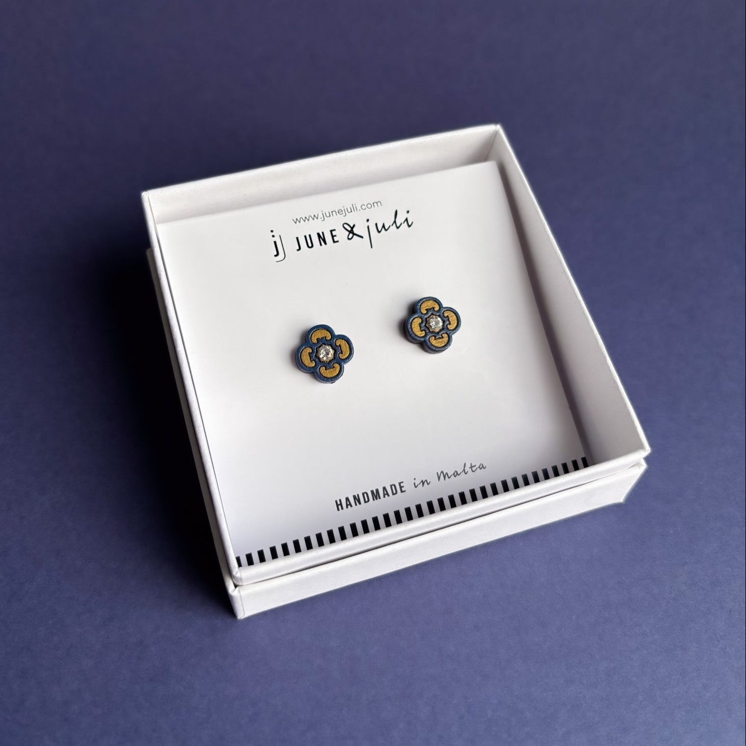Our Clover Stud Earrings are inspired by Maltese tile patterns and depict one of the quintessential mediterranean designs. They measure approximately 12mm in diameter and feature a sparkly cubic zirconia stone at their center.