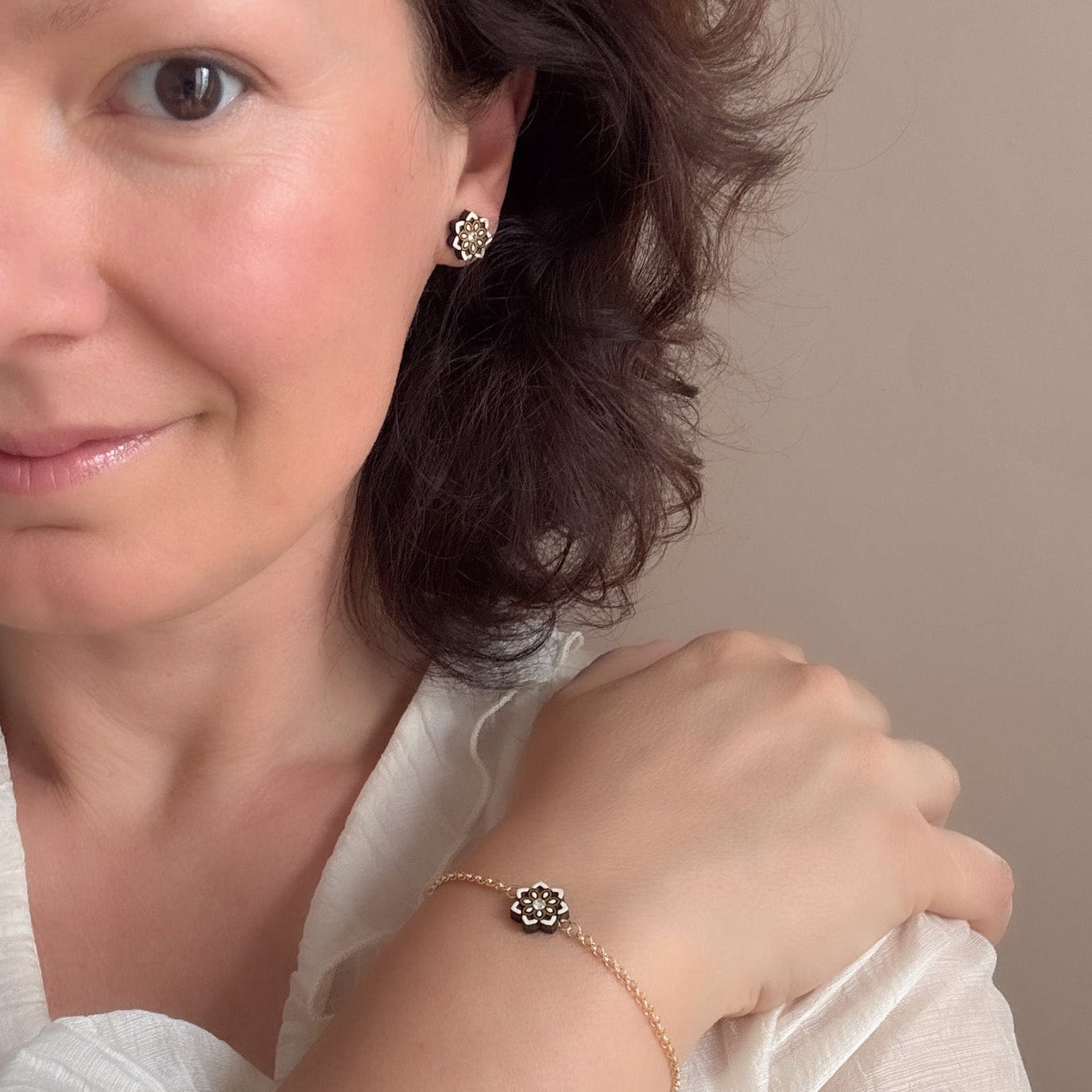Our Gabi Stud Earrings are delicate flower charms for your ear. They measure approximately 12mm in diameter and feature a sparkly cubic zirconia stone at their center. The earrings are made from hand painted wood and come in various colors.