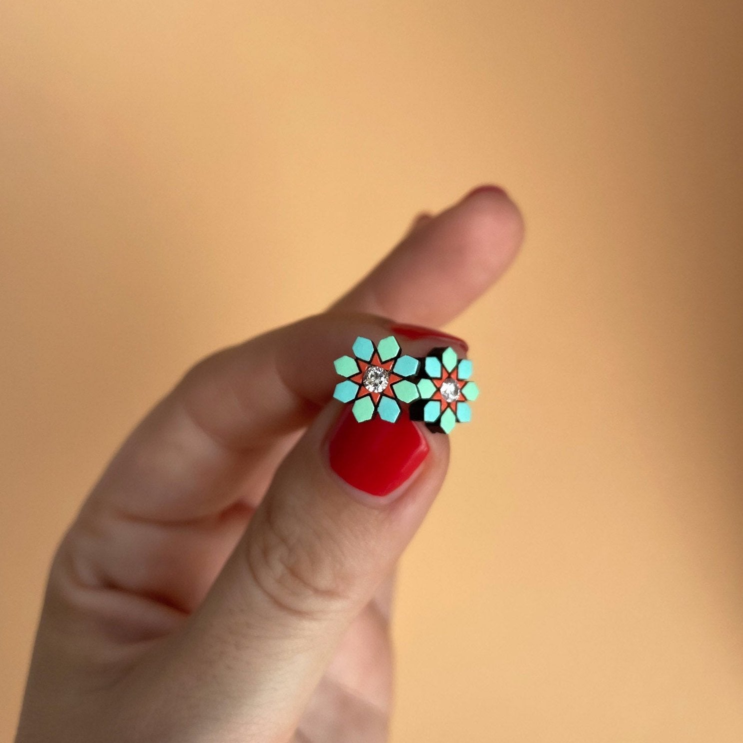 Our Stella Studs are abstract solitaire earrings with a bright and sparkly cubic zirconia stone at the center. They are made of FSC-certified wood and feature an interesting geometric pattern, inspired by Mediterranean tile designs and Arabic art.